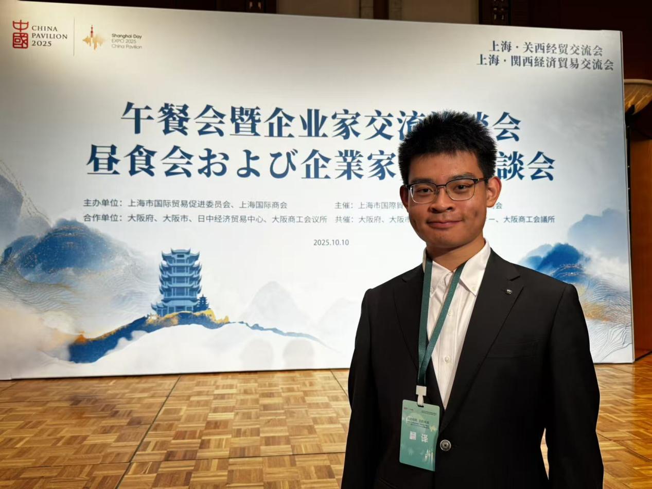 朱宸逸:感谢上外给予这次宝贵的机会,也很荣幸能作为中方翻译人员参与上海关西经贸交流会。作为本科生,顺利完成此次翻译任务,是对自己日语水平的一次成功检验。通过此次实践,我体会到翻译工作不仅需要专业的语言水平,更需要敏锐的观察与沟通能力。例如,在此次翻译过程中,有位略懂日语的中方企业家希望直接与日方交流,却因语言障碍产生误解,我需在双方对话中迅速整理并准确传达信息。这次经历让我深刻认识到语言的重要实践价值,也让我理解了译员应具备的专业素养与责任担当。
