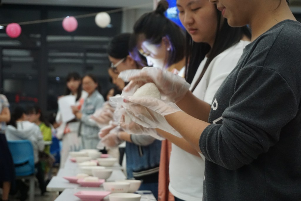 大二6个班和大一七班的代表们在日本捏饭团师傅的指导下亲手捏出了自己独特的饭团。