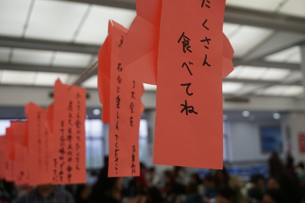 我继续四处兜转,食堂的柜台上也挂着各式各样的和风装饰物,还有那一张张来自老师们的寄语。我定睛一看,心里忍不住默默回答道:会胖。