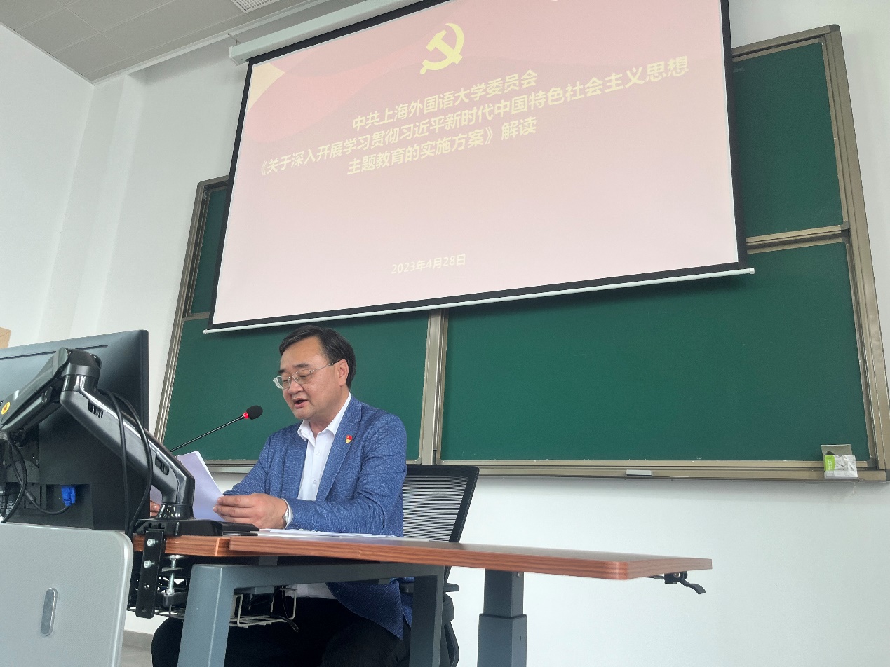 党委书记施桦老师为大家回顾了上海外国语大学召开学习贯彻习近平新时代中国特色社会主义思想主题教育动员部署会的情况和会议精神,就日院师生具体执行学校主题教育方案部署的要点进行了解读,分三点介绍了学校抓实主题教育的纲领性的总体要求。