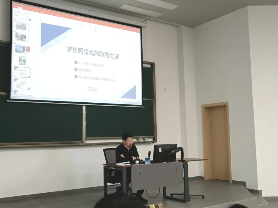 随后,赵老师向同学们回顾了自己的职业成长之路。他分享了自己的翻译经历:在一次为所长介绍服装厂产品的过程中,他没有翻译出具体的行业单词。这件事给他带来了很大的冲击,让他认识到自己在实际工作中所学到的知识和技能还不够用,并且在工作岗位上他发现老所长每天都会加班到深夜,第二天早晨又会早早地来到公司。受这位所长的启发,赵老师下定决心,要像所长一样努力工作,不断提升自己。赵老师说,在跟随老所长的过程中,他不仅学习到了很多专业知识和技能,还领悟到了深厚的人生经验,在经过不断的努力后,他逐渐得到了所长的赏识,在职业发展道路上取得了更大的成功。
