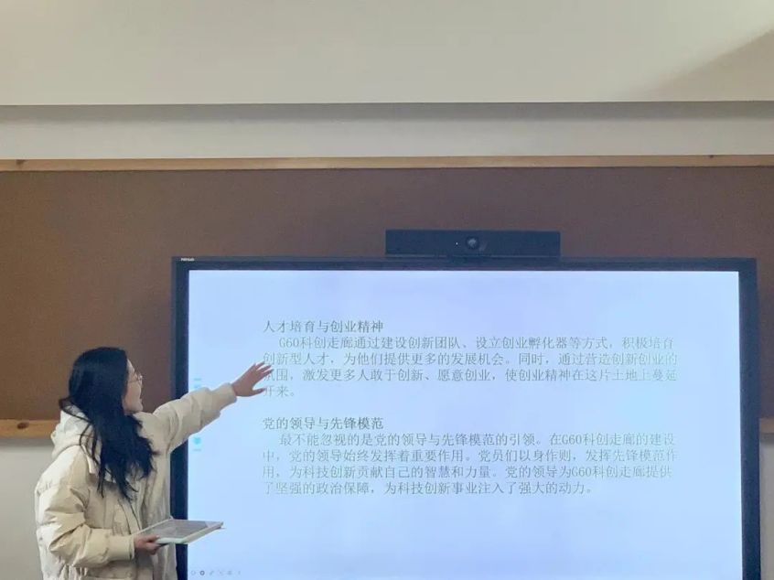 首先,由博士生朱海莹和支部组织委员祝扬烨两位同志进行党课领学。朱海莹同志从五个方面为同志们呈现了一个立体的G60科创走廊,分别是走廊背后的故事、科创走廊的脉搏、未来的发展愿景、企业家的智慧、创新政策的引导,其中特别强调了党的领导在建设G60科创走廊过程中发挥着重要作用。党员们以身作则,发挥先锋模范作用,为科技创新贡献自己的智慧和力量。党的领导为G60科创走廊提供了坚强的政治保障,为科技创新事业注入了强大的动力。