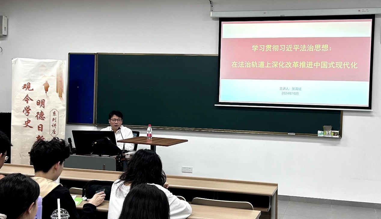 10月10日晚,我院“观今学史,明德日新”系列讲座第三讲在松江校区举行,上海市教卫工作党委系统学习贯彻党的二十届三中全会精神专家宣讲团成员、上海外国语大学法学院院长张海斌教授应邀为在座师生作了题为“在法治轨道上深化改革 推进中国式现代化”的报告,院党委书记张绍铎及近百名学生出席了活动。